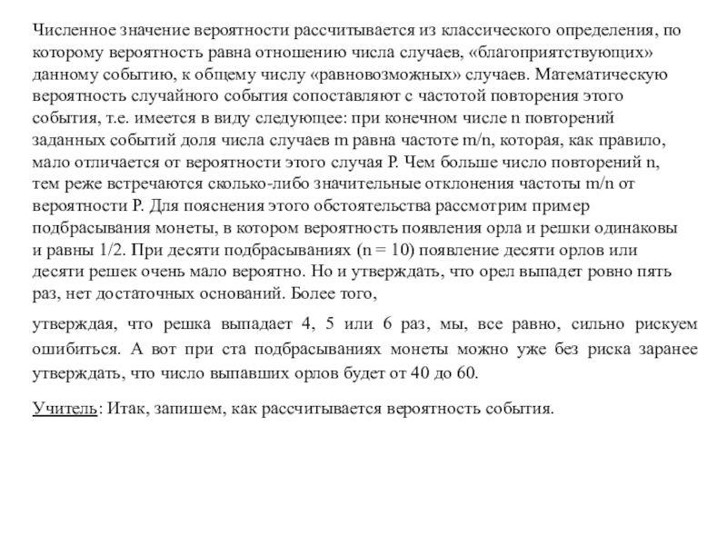 Слайд 18Численное значение вероятности рассчитывается из классического определения, по которому вероятность равна