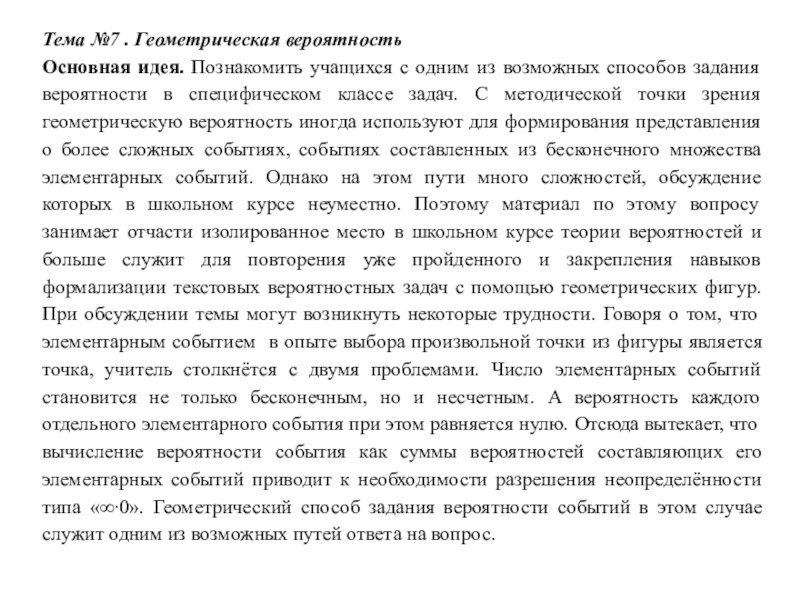 возможных способов задания вероятности в специфическом классе задач. С методической точки зрения геометрическую вероятность иногда используют для формирования представления о более сложных событиях, событиях составленных из бесконечного множества элементарных событий. Однако на этом пути много сложностей, обсуждение которых в школьном курсе неуместно. Поэтому материал по этому вопросу занимает отчасти изолированное место в школьном курсе теории вероятностей и больше служит для повторения уже пройденного и закрепления навыков формализации текстовых вероятностных задач с помощью геометрических фигур. При обсуждении темы могут возникнуть некоторые трудности. Говоря о том, что элементарным событием в опыте выбора произвольной точки из фигуры является точка, учитель столкнётся с двумя проблемами. Число элементарных событий становится не только бесконечным, но и несчетным. А вероятность каждого отдельного элементарного события при этом равняется нулю. Отсюда вытекает, что вычисление вероятности события как суммы вероятностей составляющих его элементарных событий приводит к необходимости разрешения неопределённости типа «∞∙0». Геометрический способ задания вероятности событий в этом случае служит одним из возможных путей ответа на вопрос.