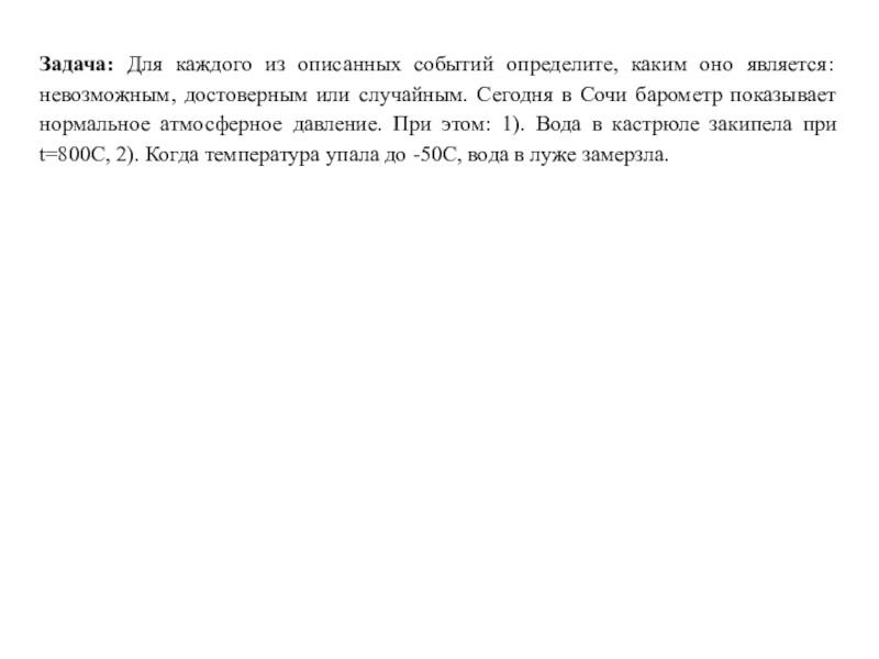 Слайд 17Задача: Для каждого из описанных событий определите, каким оно является: невозможным,