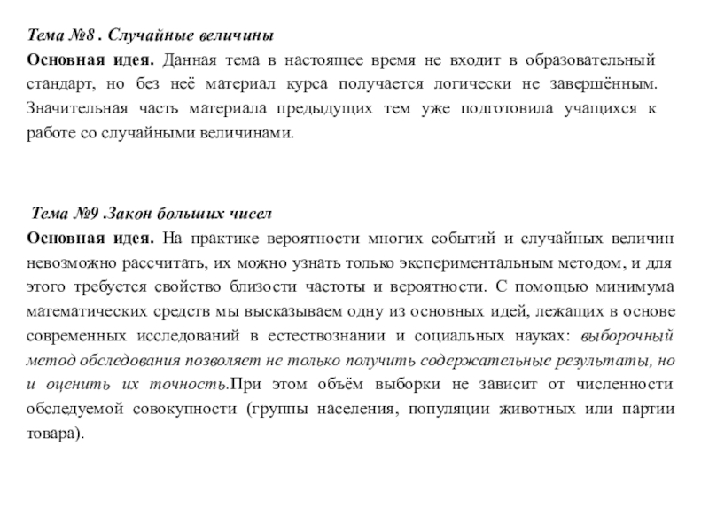 не входит в образовательный стандарт, но без неё материал курса получается логически не завершённым. Значительная часть материала предыдущих тем уже подготовила учащихся к работе со случайными величинами.