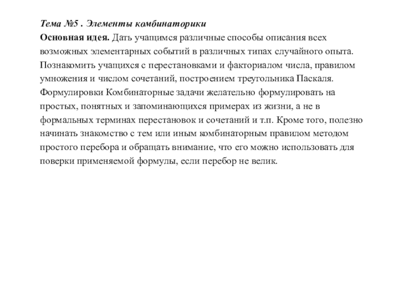 всех возможных элементарных событий в различных типах случайного опыта. Познакомить учащихся с перестановками и факториалом числа, правилом умножения и числом сочетаний, построением треугольника Паскаля. Формулировки Комбинаторные задачи желательно формулировать на простых, понятных и запоминающихся примерах из жизни, а не в формальных терминах перестановок и сочетаний и т.п. Кроме того, полезно начинать знакомство с тем или иным комбинаторным правилом методом простого перебора и обращать внимание, что его можно использовать для поверки применяемой формулы, если перебор не велик.