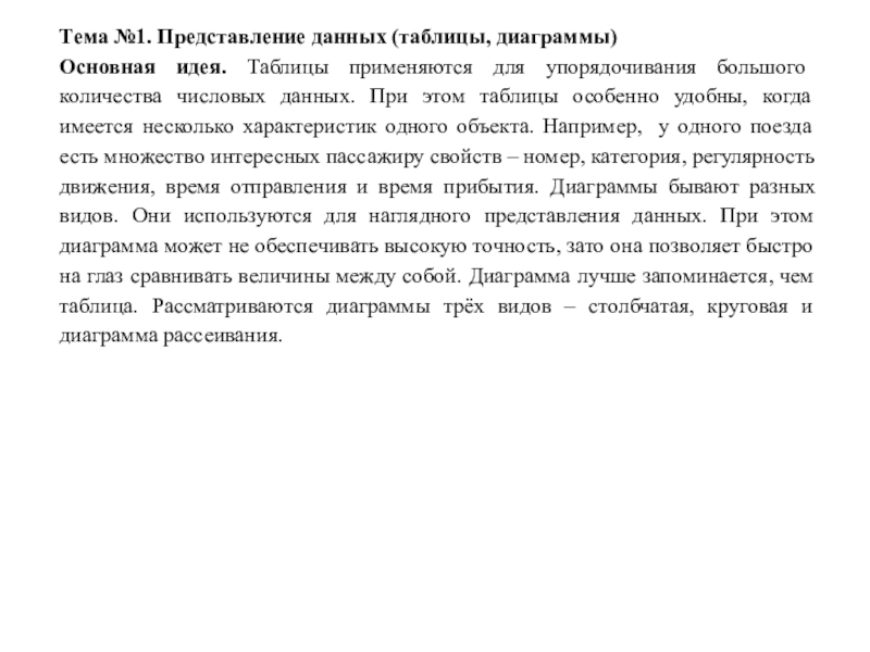 большого количества числовых данных. При этом таблицы особенно удобны, когда имеется несколько характеристик одного объекта. Например, у одного поезда есть множество интересных пассажиру свойств – номер, категория, регулярность движения, время отправления и время прибытия. Диаграммы бывают разных видов. Они используются для наглядного представления данных. При этом диаграмма может не обеспечивать высокую точность, зато она позволяет быстро на глаз сравнивать величины между собой. Диаграмма лучше запоминается, чем таблица. Рассматриваются диаграммы трёх видов – столбчатая, круговая и диаграмма рассеивания.