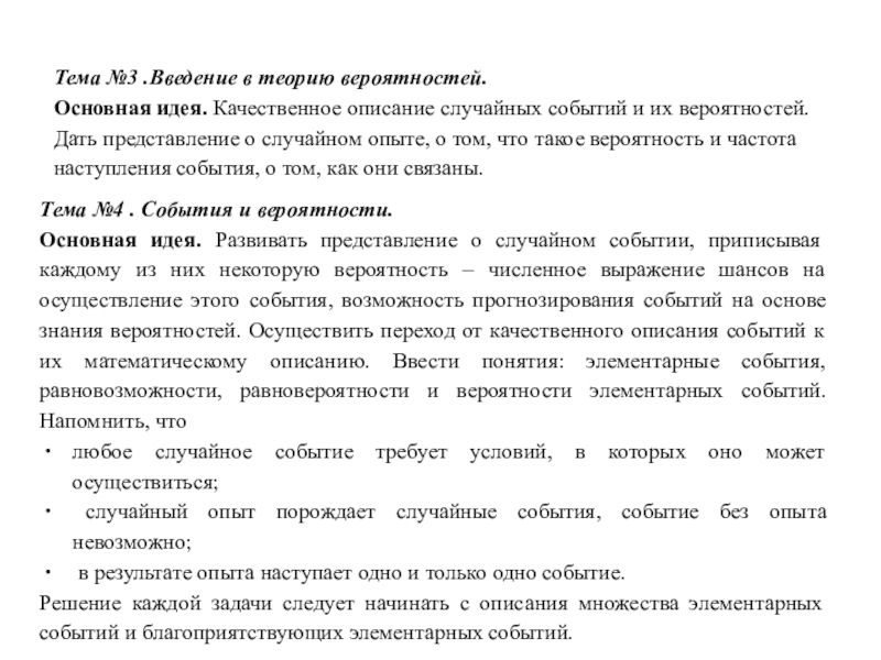 Основная идея. Развивать представление о случайном событии, приписывая каждому из них некоторую вероятность – численное выражение шансов на осуществление этого события, возможность прогнозирования событий на основе знания вероятностей. Осуществить переход от качественного описания событий к их математическому описанию. Ввести понятия: элементарные события, равновозможности, равновероятности и вероятности элементарных событий. Напомнить, что