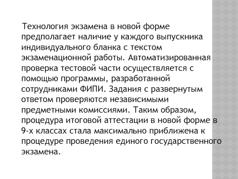 выпускника индивидуального бланка с текстом экзаменационной работы. Автоматизированная проверка тестовой части осуществляется с помощью программы, разработанной сотрудниками ФИПИ. Задания с развернутым ответом проверяются независимыми предметными комиссиями. Таким образом, процедура итоговой аттестации в новой форме в 9-х классах стала максимально приближена к процедуре проведения единого государственного экзамена.