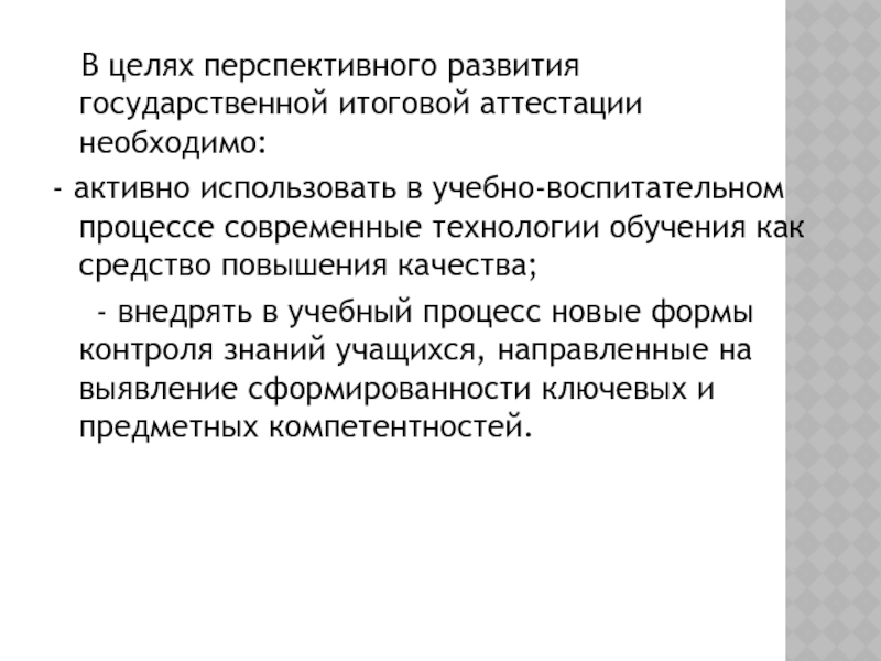 Слайд 15 В целях перспективного развития государственной итоговой аттестации необходимо: