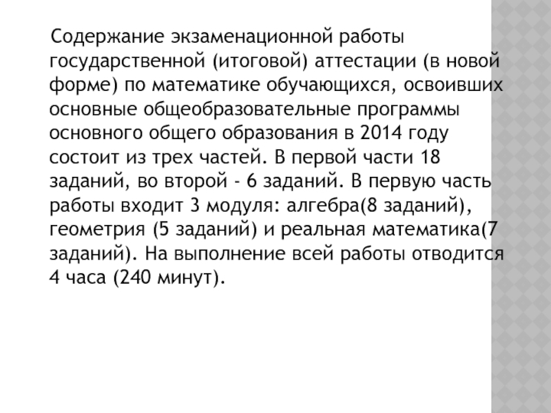 по математике обучающихся, освоивших основные общеобразовательные программы основного общего образования в 2014 году состоит из трех частей. В первой части 18 заданий, во второй - 6 заданий. В первую часть работы входит 3 модуля: алгебра(8 заданий), геометрия (5 заданий) и реальная математика(7 заданий). На выполнение всей работы отводится 4 часа (240 минут).