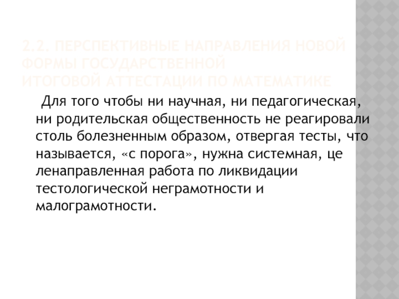 Для того чтобы ни научная, ни педагогическая, ни родительская общественность не реагировали столь болезненным образом, отвергая тесты, что называется, «с порога», нужна системная, целенаправленная работа по ликвидации тестологической неграмотности и малограмотности.