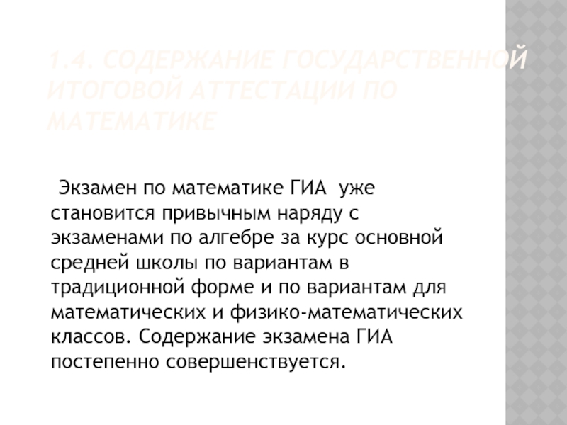 ГИА уже становится привычным наряду с экзаменами по алгебре за курс основной средней школы по вариантам в традиционной форме и по вариантам для математических и физико-математических классов. Содержание экзамена ГИА постепенно совершенствуется.