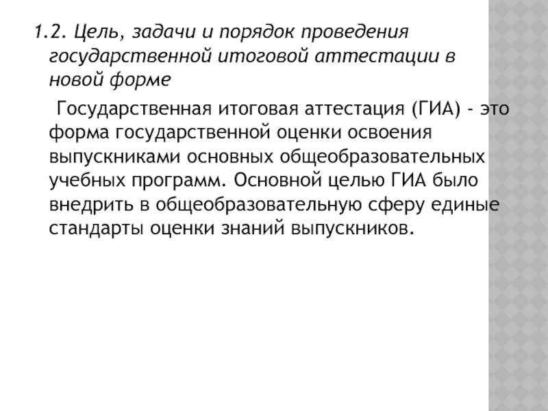 Государственная итоговая аттестация (ГИА) - это форма государственной оценки освоения выпускниками основных общеобразовательных учебных программ. Основной целью ГИА было внедрить в общеобразовательную сферу единые стандарты оценки знаний выпускников.