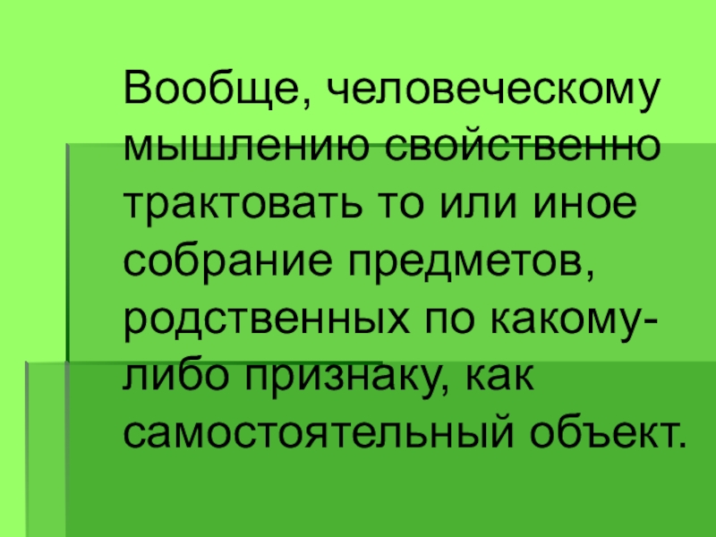 Слайд 7Вообще, человеческому мышлению свойственно трактовать то или иное собрание предметов, родственных
