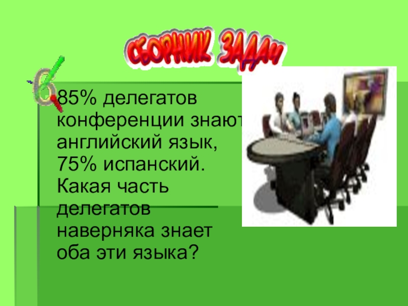 Слайд 4585% делегатов конференции знают английский язык, 75% испанский. Какая часть делегатов