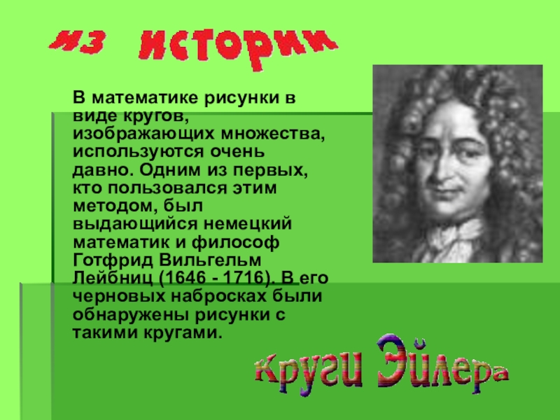 Одним из первых, кто пользовался этим методом, был выдающийся немецкий математик и философ Готфрид Вильгельм Лейбниц (1646 - 1716). В его черновых набросках были обнаружены рисунки с такими кругами.