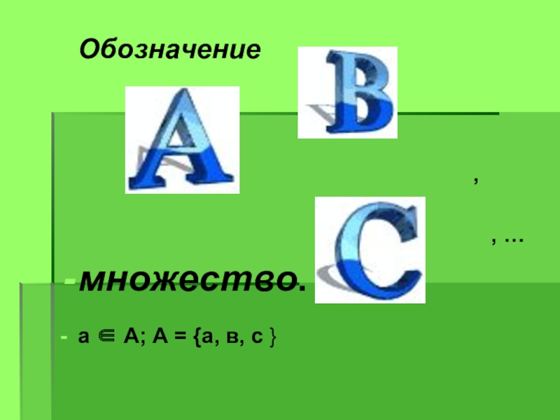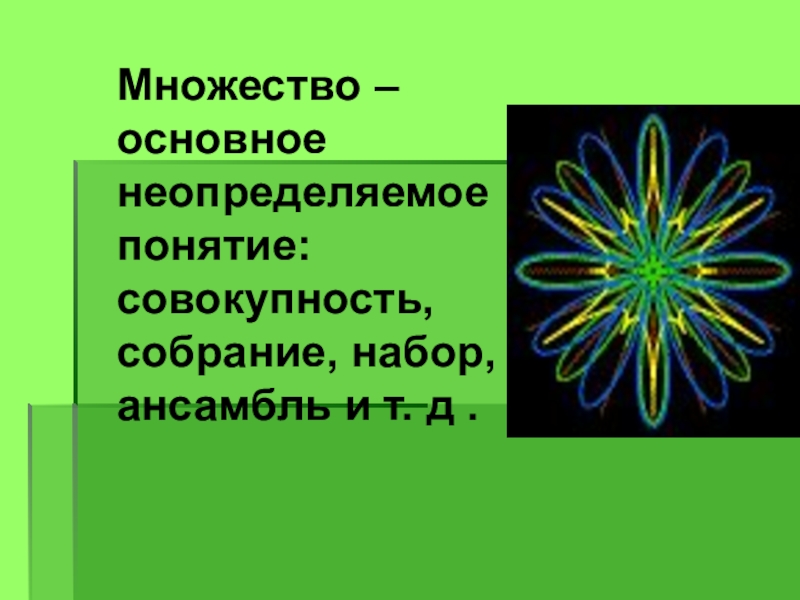 Слайд 8Множество – основное неопределяемое понятие: совокупность, собрание, набор, ансамбль и т.