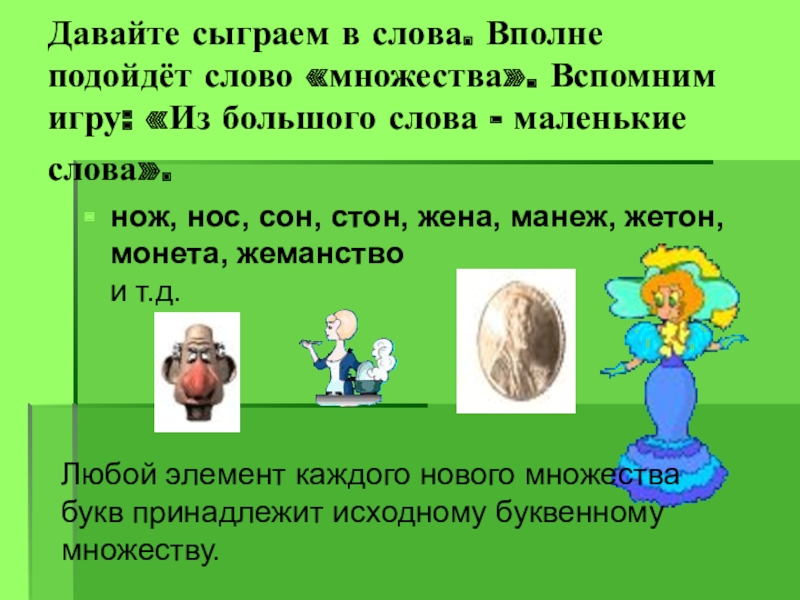 Слайд 19Давайте сыграем в слова. Вполне подойдёт слово «множества». Вспомним игру: «Из