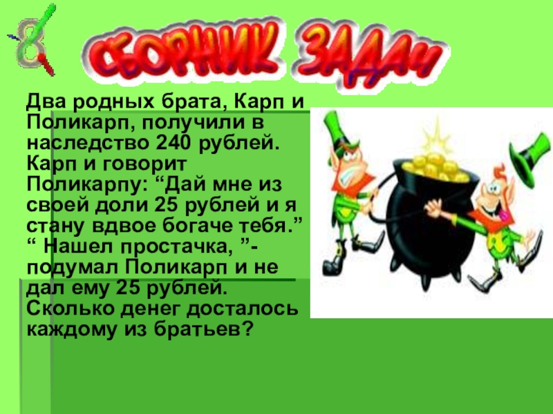 Слайд 47Два родных брата, Карп и Поликарп, получили в наследство 240 рублей.