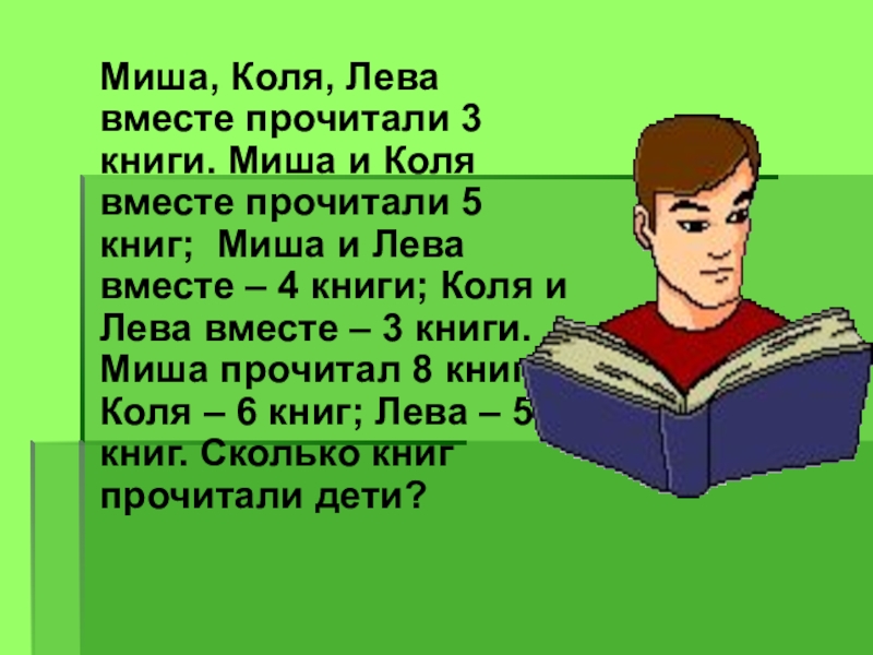 Слайд 34Миша, Коля, Лева вместе прочитали 3 книги. Миша и Коля вместе