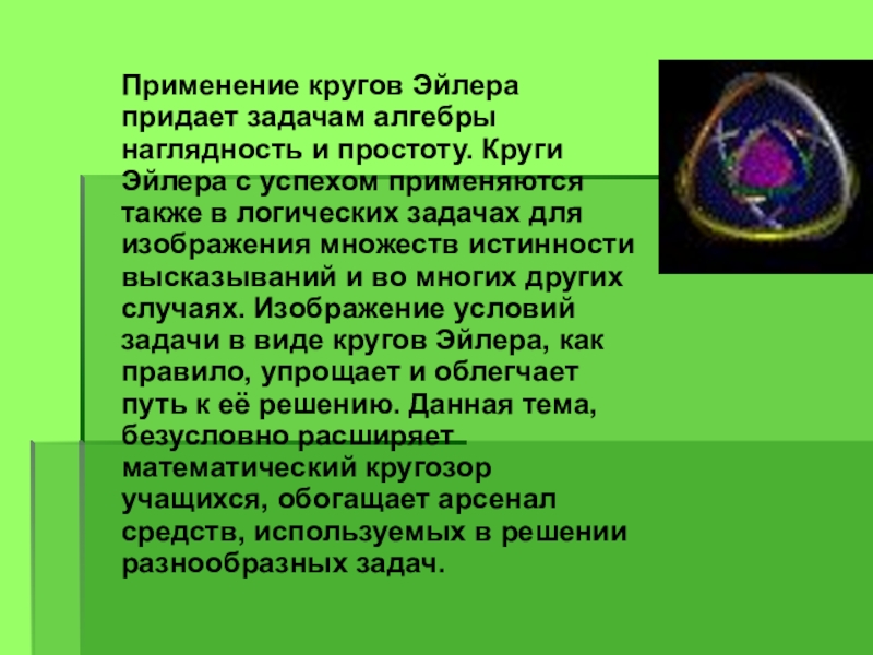 с успехом применяются также в логических задачах для изображения множеств истинности высказываний и во многих других случаях. Изображение условий задачи в виде кругов Эйлера, как правило, упрощает и облегчает путь к её решению. Данная тема, безусловно расширяет математический кругозор учащихся, обогащает арсенал средств, используемых в решении разнообразных задач.