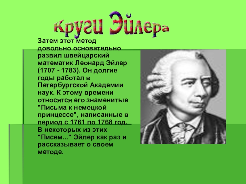 - 1783). Он долгие годы работал в Петербургской Академии наук. К этому времени относятся его знаменитые "Письма к немецкой принцессе", написанные в период с 1761 по 1768 год. В некоторых из этих "Писем..." Эйлер как раз и рассказывает о своем методе.