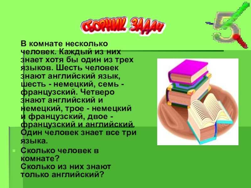 из трех языков. Шесть человек знают английский язык, шесть - немецкий, семь - французский. Четверо знают английский и немецкий, трое - немецкий и французский, двое - французский и английский. Один человек знает все три языка.
