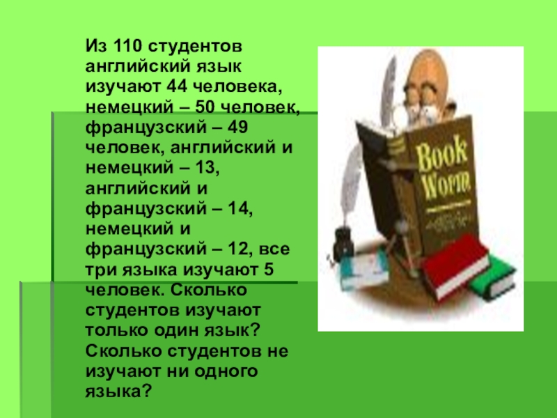 Слайд 35Из 110 студентов английский язык изучают 44 человека, немецкий – 50
