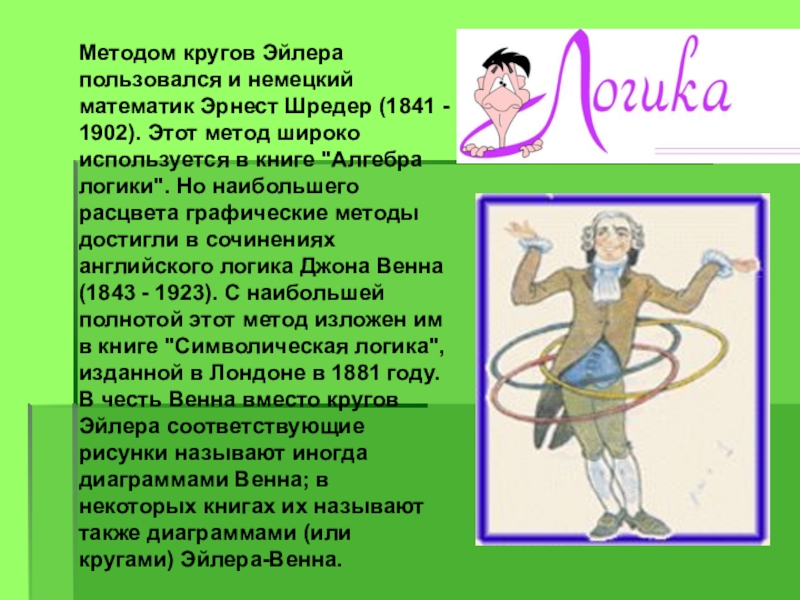 Слайд 28Методом кругов Эйлера пользовался и немецкий математик Эрнест Шредер (1841 -