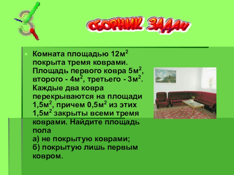 Слайд 42Комната площадью 12м2 покрыта тремя коврами. Площадь первого ковра 5м2, второго
