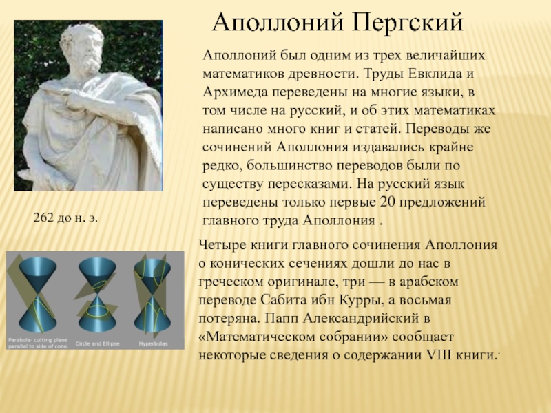 Четыре книги главного сочинения Аполлония о конических сечениях дошли до нас в греческом оригинале, три — в арабском переводе Сабита ибн Курры, а восьмая потеряна. Папп Александрийский в «Математическом собрании» сообщает некоторые сведения о содержании VIII книги..