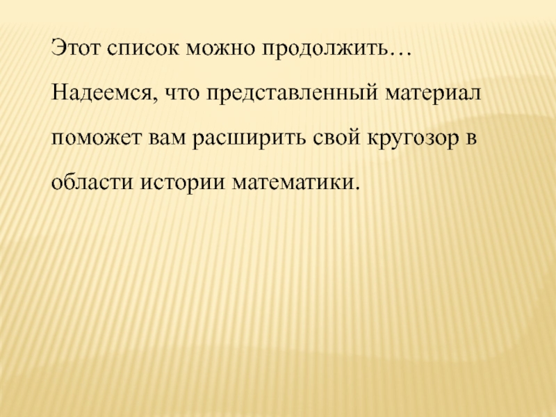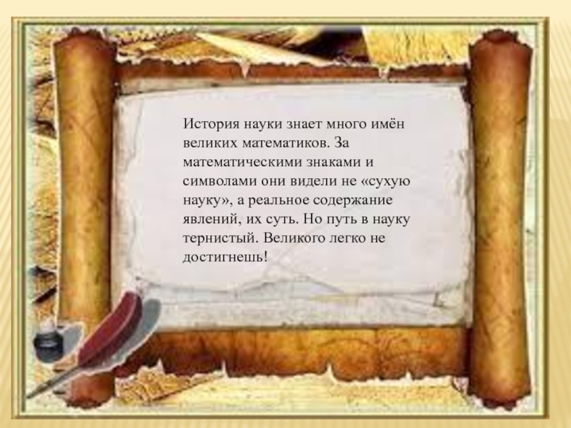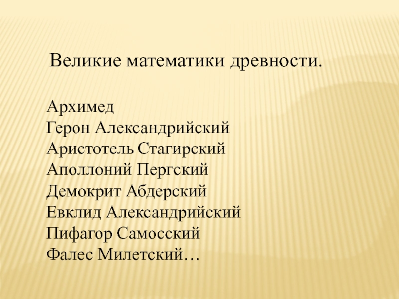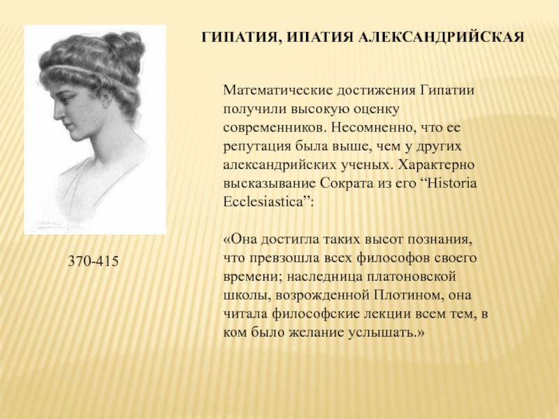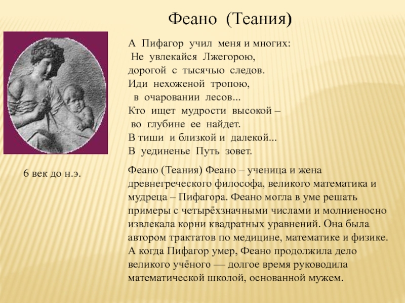 Феано (Теания) Феано – ученица и жена древнегреческого философа, великого математика и мудреца – Пифагора. Феано могла в уме решать примеры с четырёхзначными числами и молниеносно извлекала корни квадратных уравнений. Она была автором трактатов по медицине, математике и физике. А когда Пифагор умер, Феано продолжила дело великого учёного — долгое время руководила математической школой, основанной мужем.