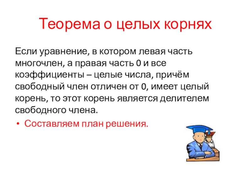 представление о приёмах решения целых уравнений. Ознакомить учащихся с теоремой Безу и теоремой о целых корнях целого уравнения