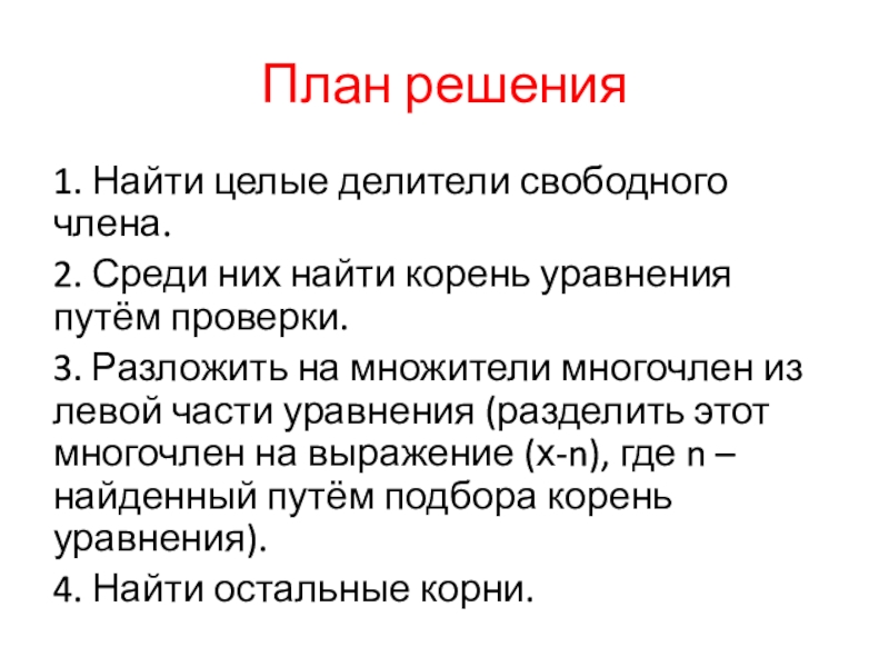 3. Разложить на множители многочлен из левой части уравнения (разделить этот многочлен на выражение (х-n), где n – найденный путём подбора корень уравнения).