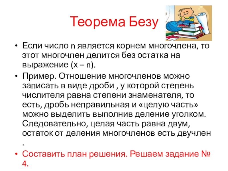Разобрать пример с применением теоремы Безу и разработать свой план решения