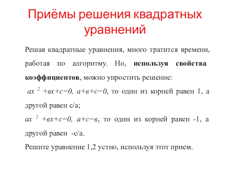 ах 2 +вх+с=0, а+в+с=0, то один из корней равен 1, а другой равен с/а;