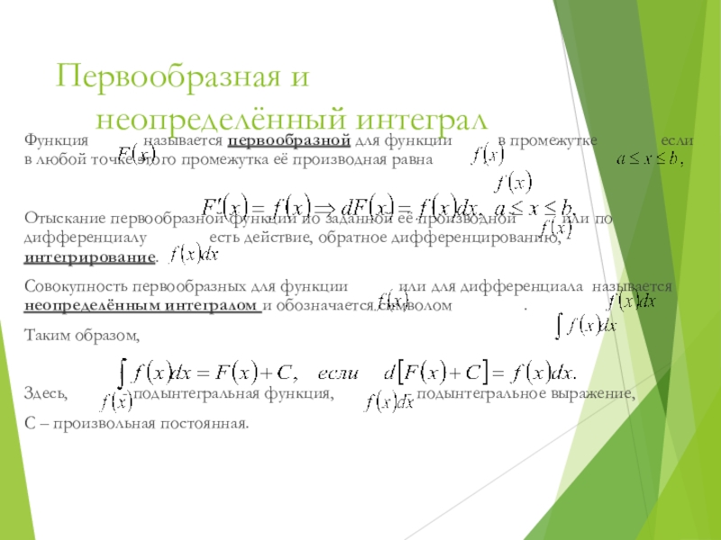 Первообразная и неопределённый интегралФункция      называется первообразной для функции