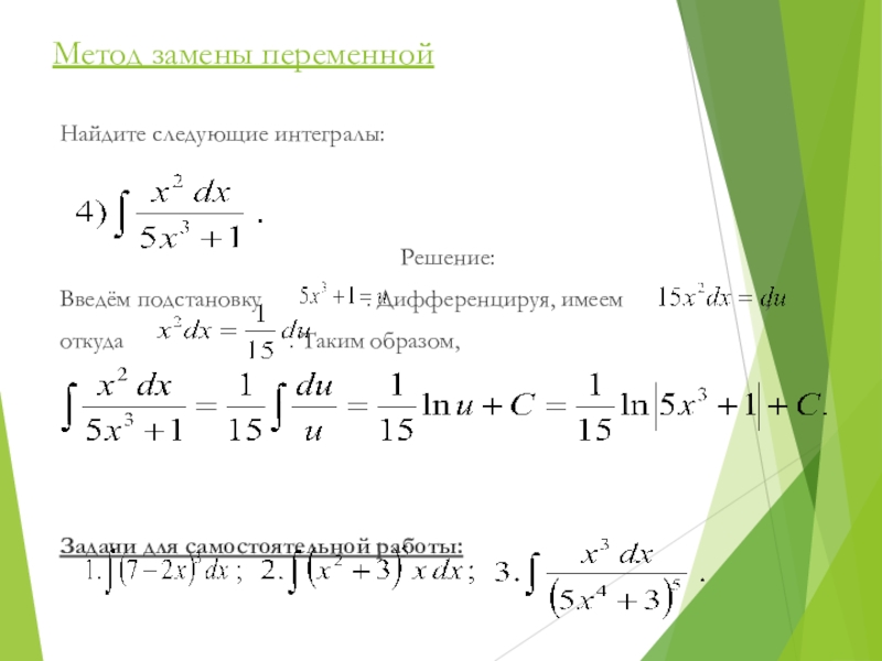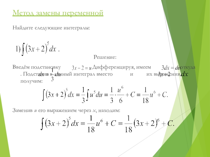 Метод замены переменнойНайдите следующие интегралы:Решение:Введём подстановку         . Дифференцируя, имеем