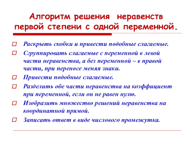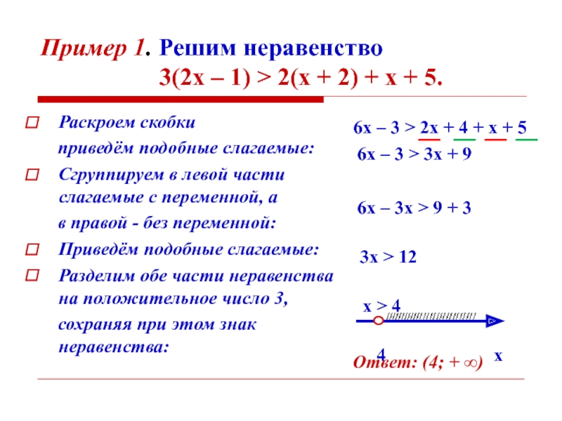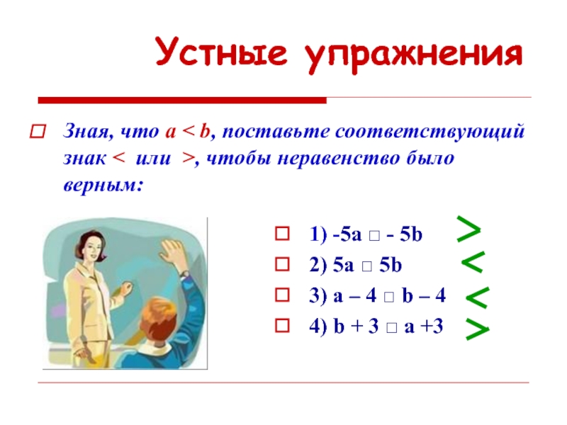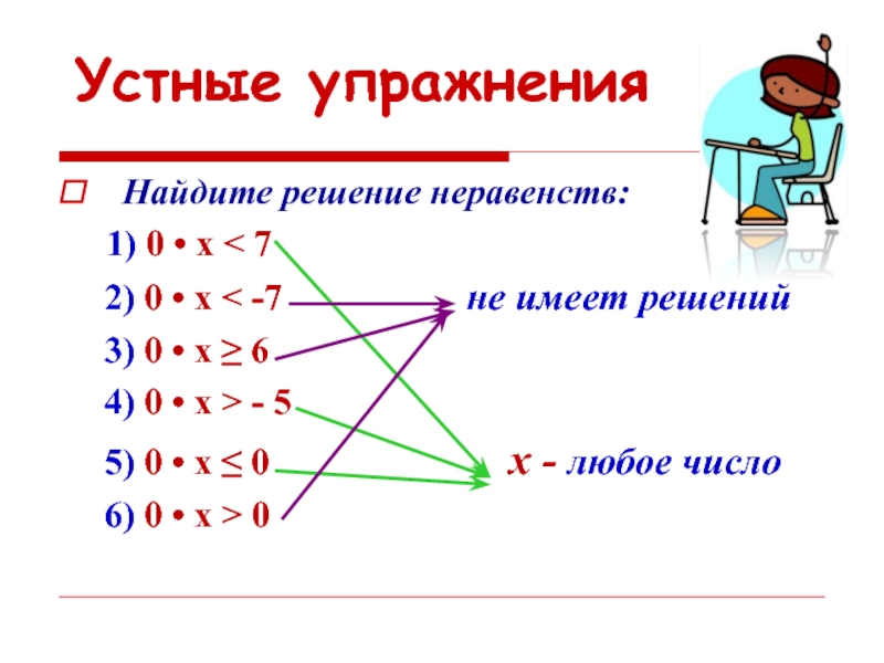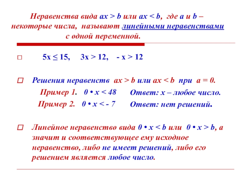 рассмотреть решение линейных неравенств вида ах > b, ax < b;