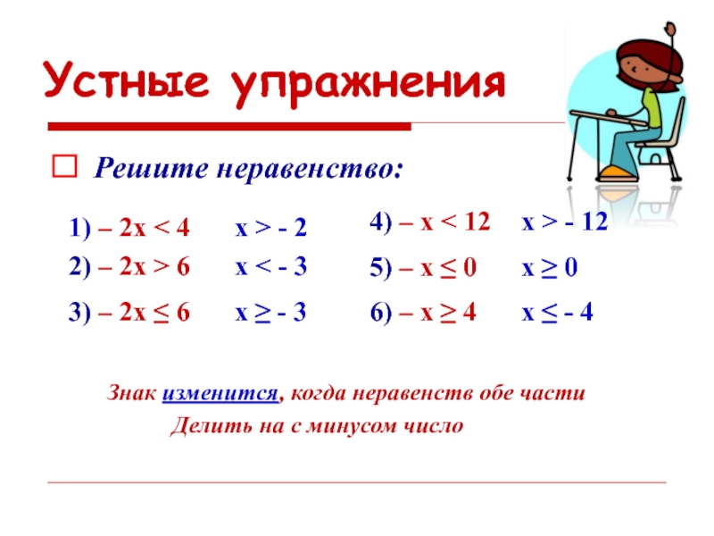 Разделим обе части на отрицательное число – 1, изменив знак неравенства на противоположный: