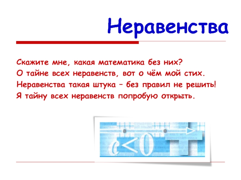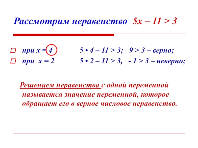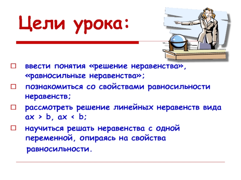 ввести понятия «решение неравенства», «равносильные неравенства»;