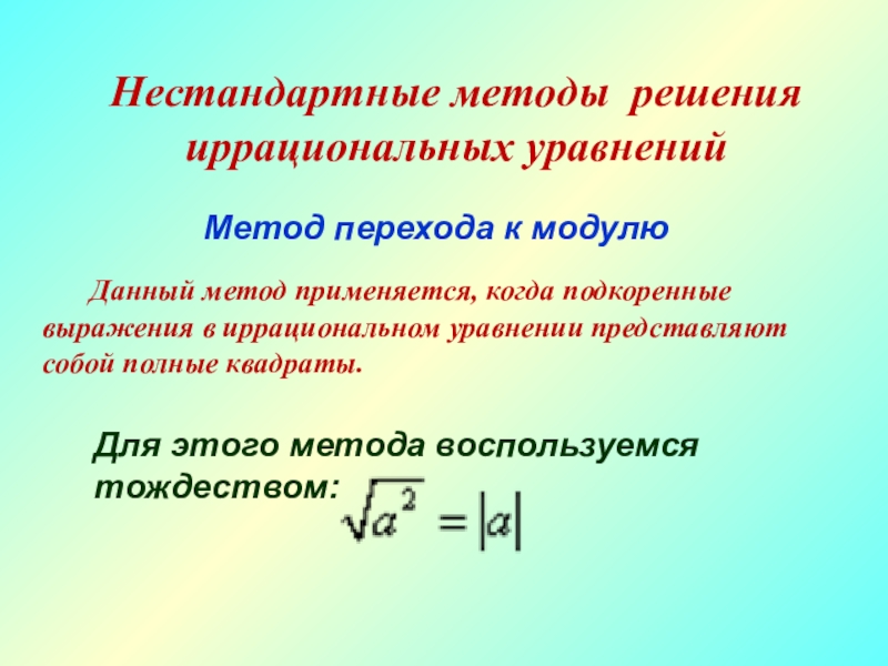 Данный метод применяется, когда подкоренные выражения в иррациональном уравнении представляют собой полные квадраты.