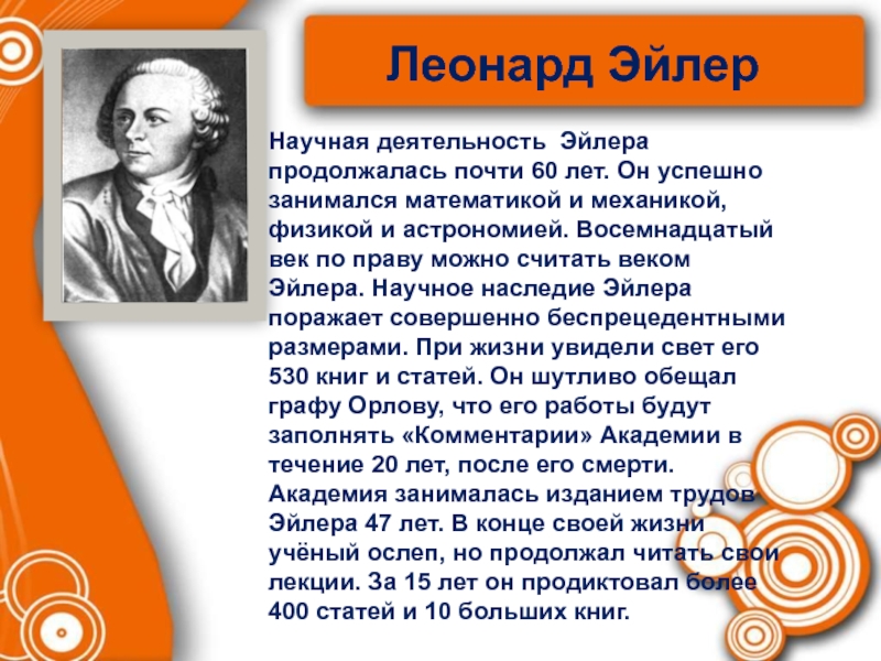 Научная деятельность Эйлера продолжалась почти 60 лет. Он успешно занимался