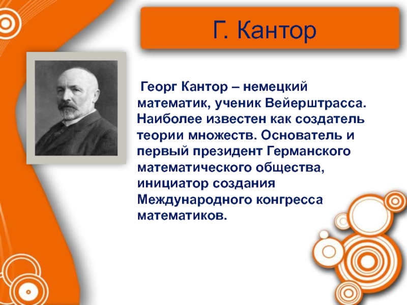 Георг Кантор – немецкий математик, ученик Вейерштрасса.