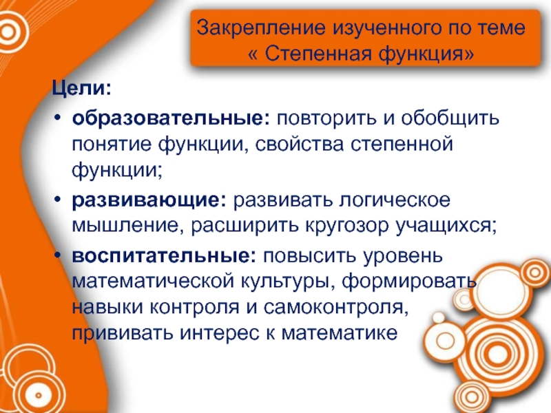 Слайд 3Закрепление изученного по теме « Степенная функция»