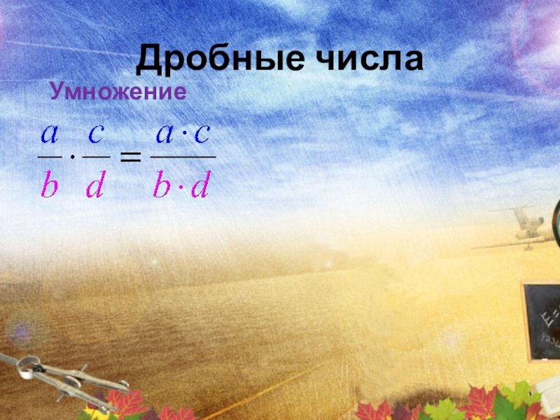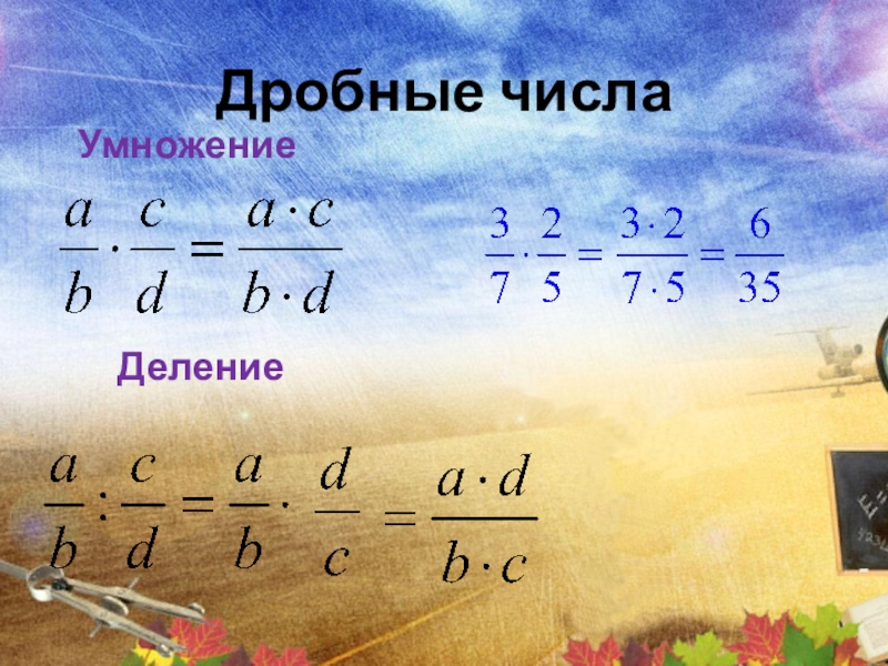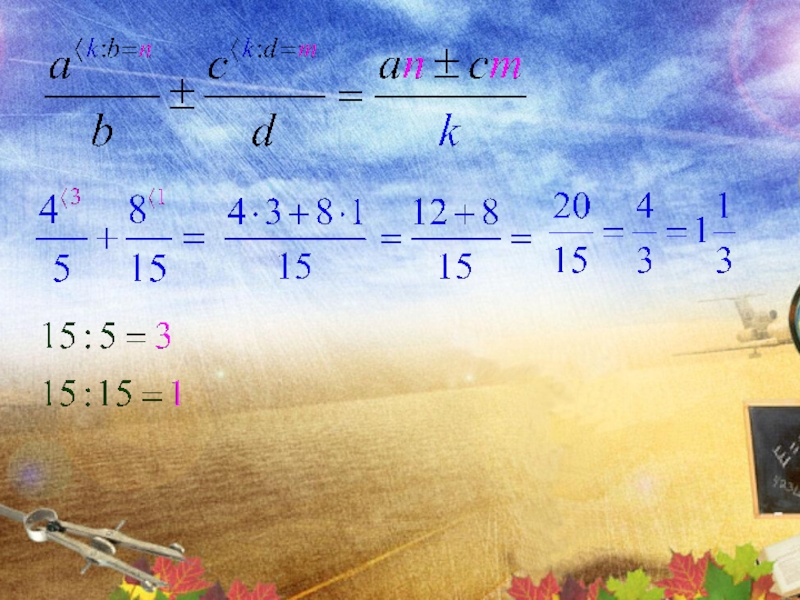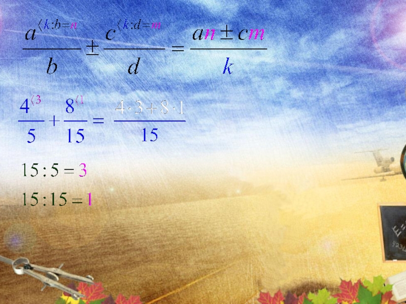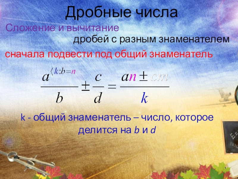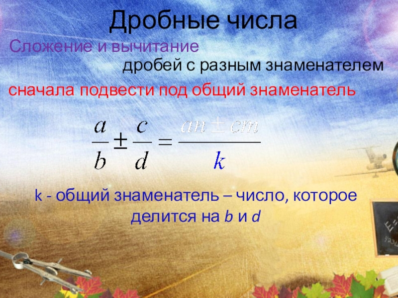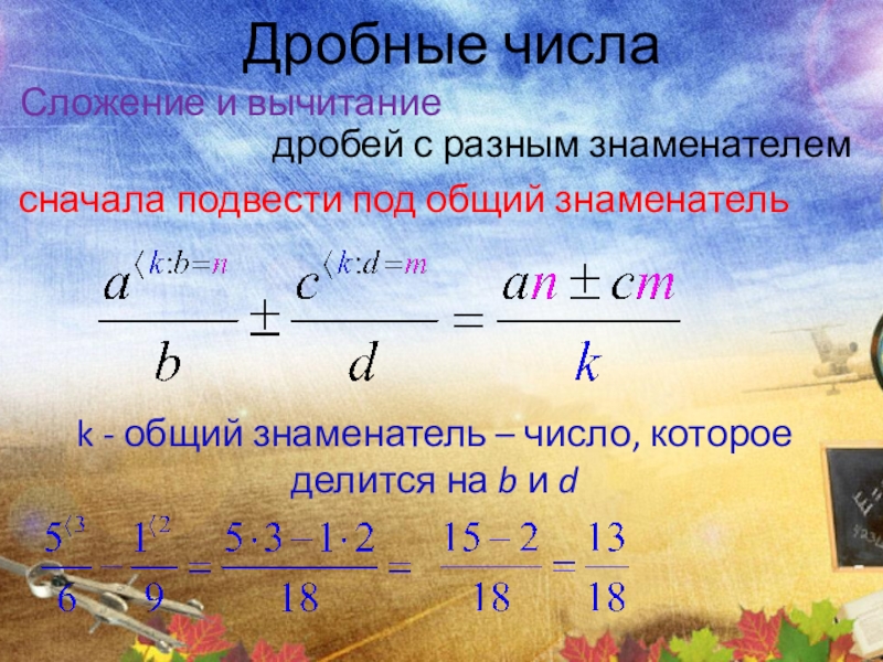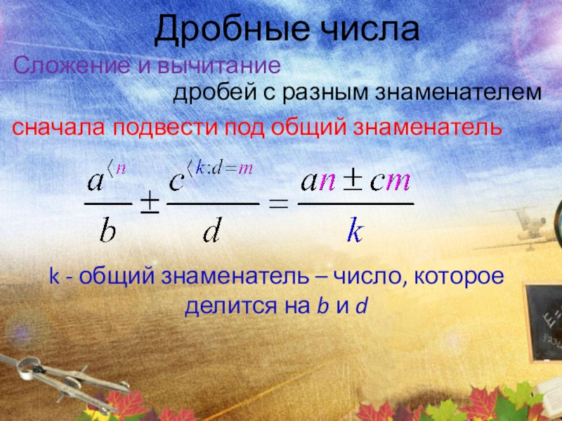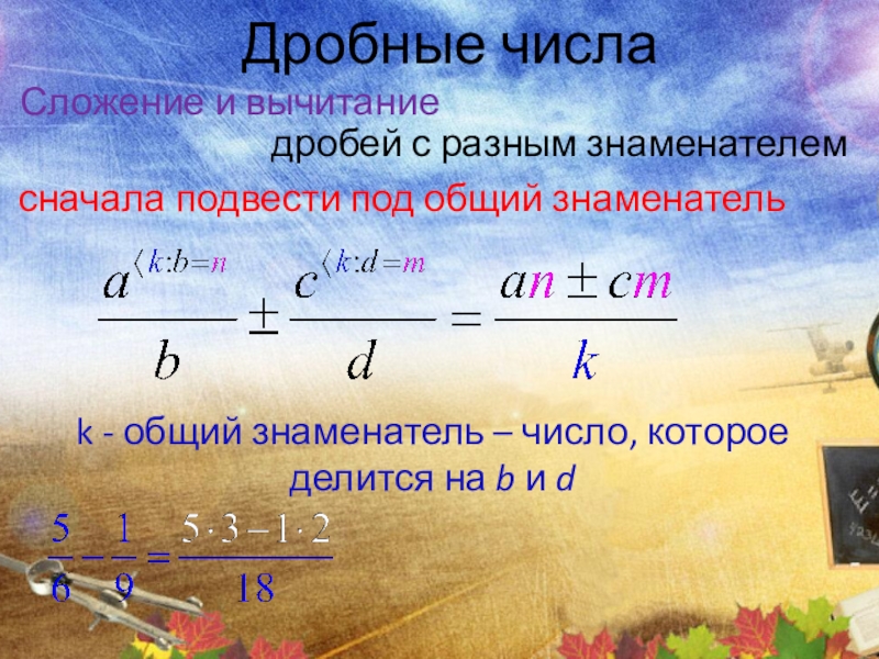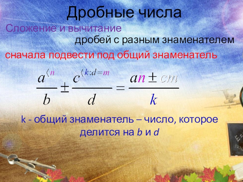 Дробные числаСложение и вычитаниедробей с разным знаменателемсначала подвести под общий знаменательk - общий знаменатель – число, которое