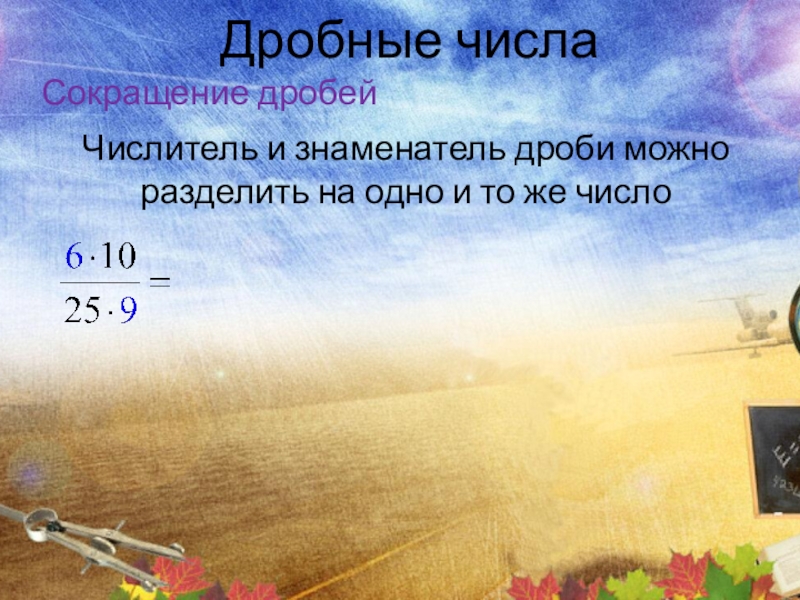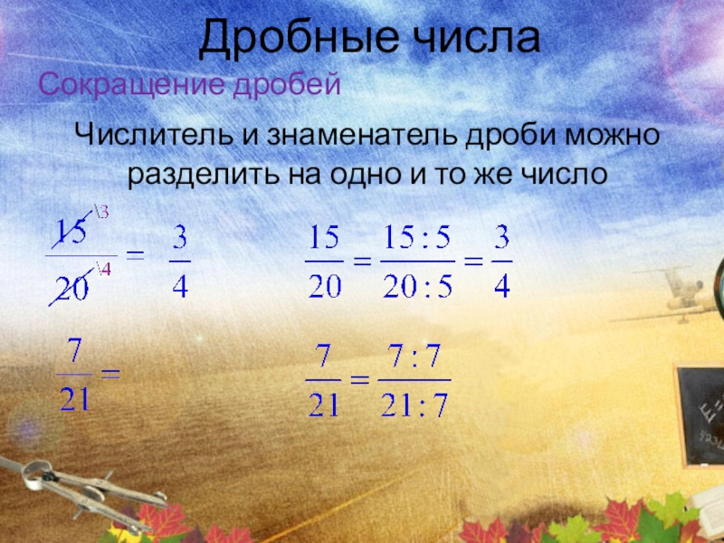 Дробные числаСокращение дробейЧислитель и знаменатель дроби можно разделить на одно и то же число