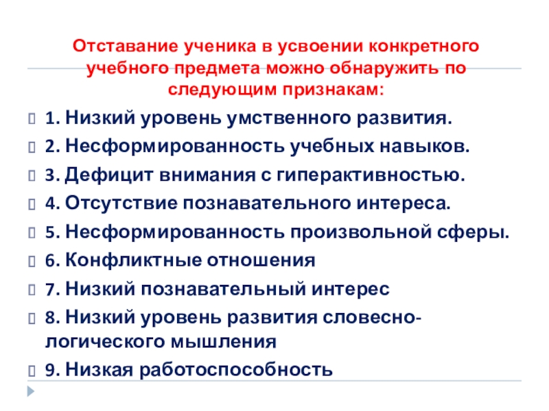 Слайд 10Отставание ученика в усвоении конкретного учебного предмета можно обнаружить по следующим