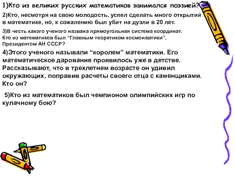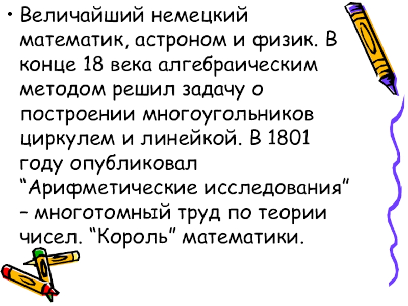 4)Этого ученого называли “королем” математики. Его математическое дарование проявилось уже в детстве. Рассказывают, что в трехлетнем возрасте он удивил окружающих, поправив расчеты своего отца с каменщиками. Кто он?
