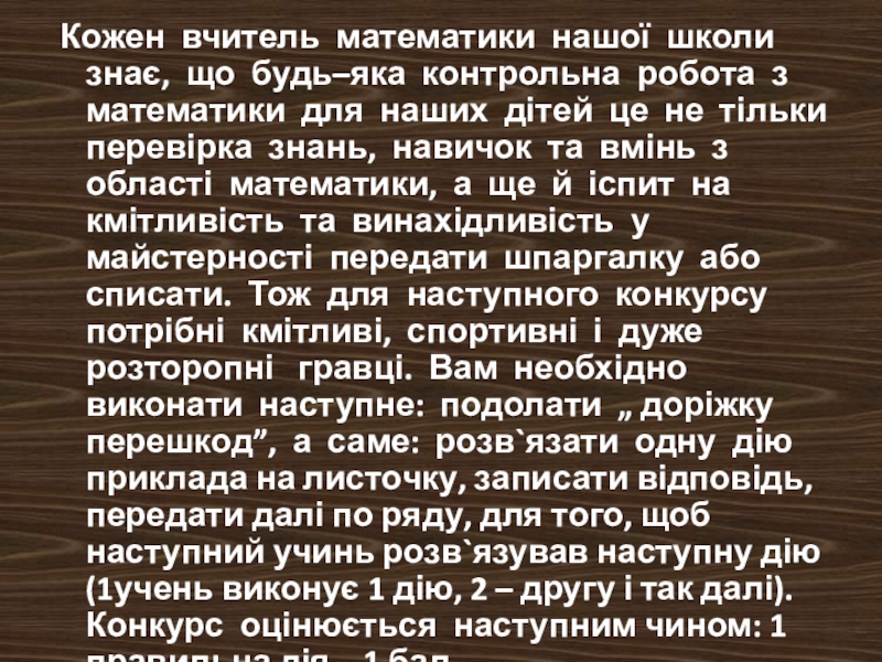 з математики для наших дітей це не тільки перевірка знань, навичок та вмінь з області математики, а ще й іспит на кмітливість та винахідливість у майстерності передати шпаргалку або списати. Тож для наступного конкурсу потрібні кмітливі, спортивні і дуже розторопні гравці. Вам необхідно виконати наступне: подолати „ доріжку перешкод”, а саме: розв`язати одну дію приклада на листочку, записати відповідь, передати далі по ряду, для того, щоб наступний учинь розв`язував наступну дію (1учень виконує 1 дію, 2 – другу і так далі). Конкурс оцінюється наступним чином: 1 правильна дія – 1 бал.