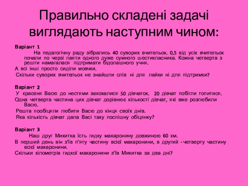 Слайд 9Правильно складені задачі виглядають наступним чином: