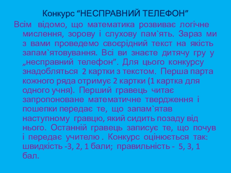 і слухову пам`ять. Зараз ми з вами проведемо своєрідний текст на якість запам`ятовування. Всі ви знаєте дитячу гру у „несправний телефон”. Для цього конкурсу знадобляться 2 картки з текстом. Перша парта кожного ряда отримує 2 картки (1 картка для одного учня). Перший гравець читає запропоноване математичне твердження і пошепки передає те, що запам`ятав наступному гравцю, який сидить позаду від нього. Останній гравець записує те, що почув і передає учителю . Конкурс оцінюється так: швидкість -3, 2, 1 бали; правильність - 5, 3, 1 бал.