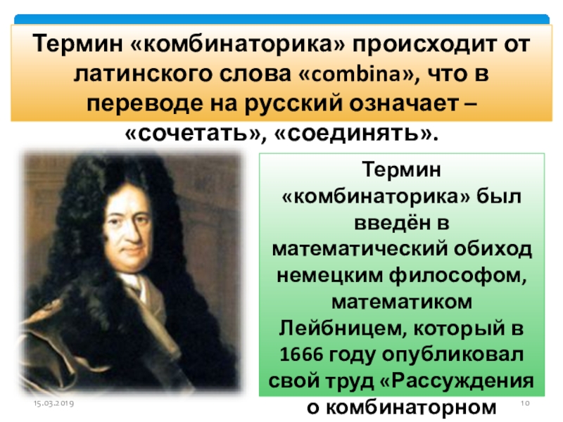 Термин «комбинаторика» происходит от латинского слова «combina», что в переводе на русский означает – «сочетать», «соединять».