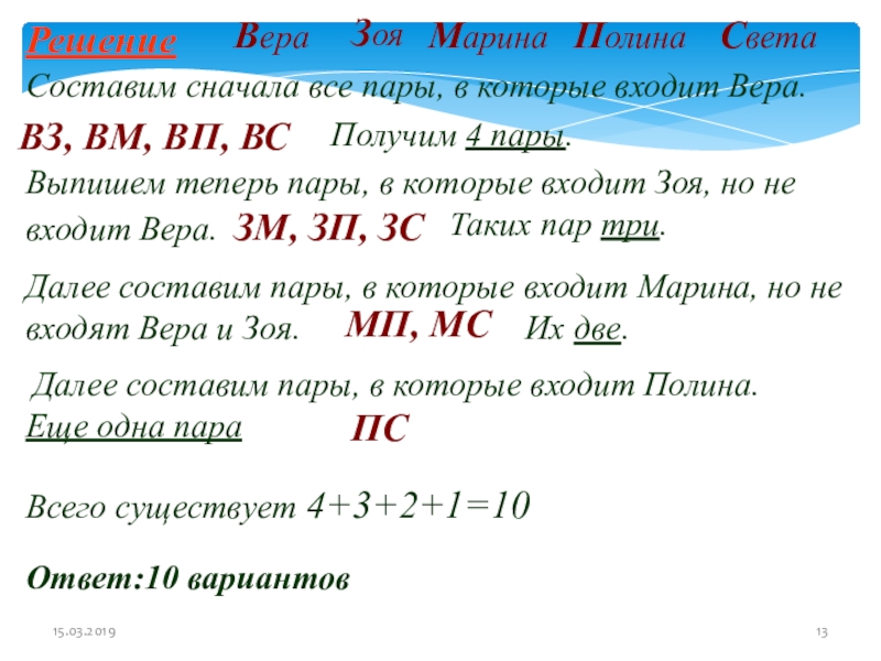 Далее составим пары, в которые входит Марина, но не входят Вера и Зоя.